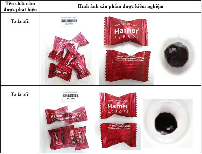 Kết quả, có 4 mẫu chứa tadalafil với hàm lượng từ 92,63 mg – 266,94 mg/1 viên (bao gồm các nhãn hiệu: kẹo ngậm Hamer 37F82K; kẹo ngậm Hamer G28Q79; kẹo ngậm Hamer E854A9; kẹo ngậm Hamer GINSENG & COFFEE).