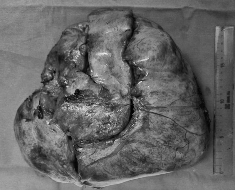 TS. Ngô Vi Hải – Chủ nhiệm Khoa Ngoại lồng ngực cho biết: “Chúng tôi đã tiến hành mổ ngực đường sau bên. Khối u phát triển từ lá tạng của thùy dưới phổi bên trái, dính một phần vào cơ hoành. Diện bóc tách rất rộng và khó khăn do khối u quá lớn, tuy nhiên kíp mổ vẫn kiểm soát tốt. Khối u có kích thước lớn khoảng 25 x 25cm, nặng hơn 5kg”.