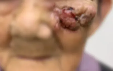 Bệnh nhân L.T.H (92 tuổi, ngụ tỉnh Khánh Hòa) đã phải chịu đựng sùi loét da má trái trong một thời gian dài. Sau khi nhập Khoa Ung bướu, bệnh nhân được chẩn đoán mắc ung thư da lan rộng vùng mặt.
