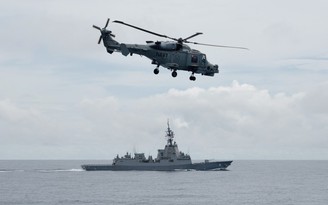 Một chiếc trực thăng AW159 Wildcat của hải quân Philippines bay, trong khi tàu khu trục HMAS Brisbane di chuyển trong một hoạt động hợp tác hàng hải giữa hải quân Philippines, Úc và Canada gần bãi cạn Scarborough ngày 2.9.2025 ẢNH: AFP