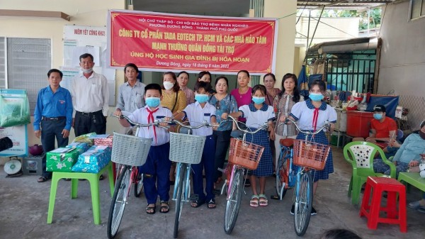 Các học sinh là con hộ gia đình bị hỏa hoạn ở xóm Cồn (TP.Phú Quốc, Kiên Giang) đã được hỗ trợ đồ dùng học tập, xe đạp.