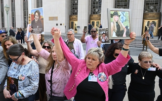 Một số phụ huynh có con qua đời vì ảnh hưởng của mạng xã hội đứng trước tòa án tại Los Angeles ngày 25.3 sau khi bản án trong vụ Meta và Google được đưa ra ẢNH: AP