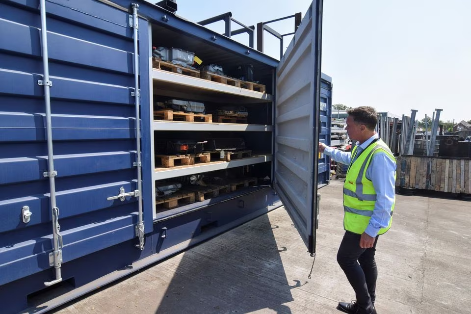 Ông Marc Trent, Tổng giám đốc công ty tháo dỡ phương tiện Charles Trent Ltd, mở một thùng chứa được chế tạo đặc biệt để chứa pin xe điện đã qua sử dụng