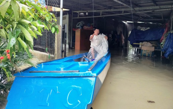 Tại khu dân cư Mỹ Thạch Trung (P.Hòa Thuận, TP.Tam Kỳ), nước dâng cao gây ngập sâu gần 1 m, người dân ở đây phải sử dụng ghe để làm phương tiện di chuyển.