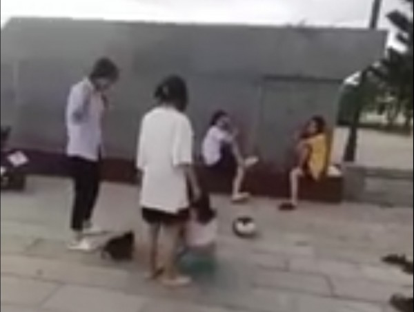 Hai nữ sinh đánh hội đồng em D.T, xung quanh còn có các em khác cười đùa, chế giễu |