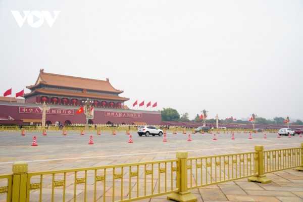 Quốc kỳ Việt Nam tung bay trên Quảng trường Thiên An Môn cùng với Quốc kỳ Trung Quốc, chào đón chuyến thăm của Tổng Bí thư Nguyễn Phú Trọng.