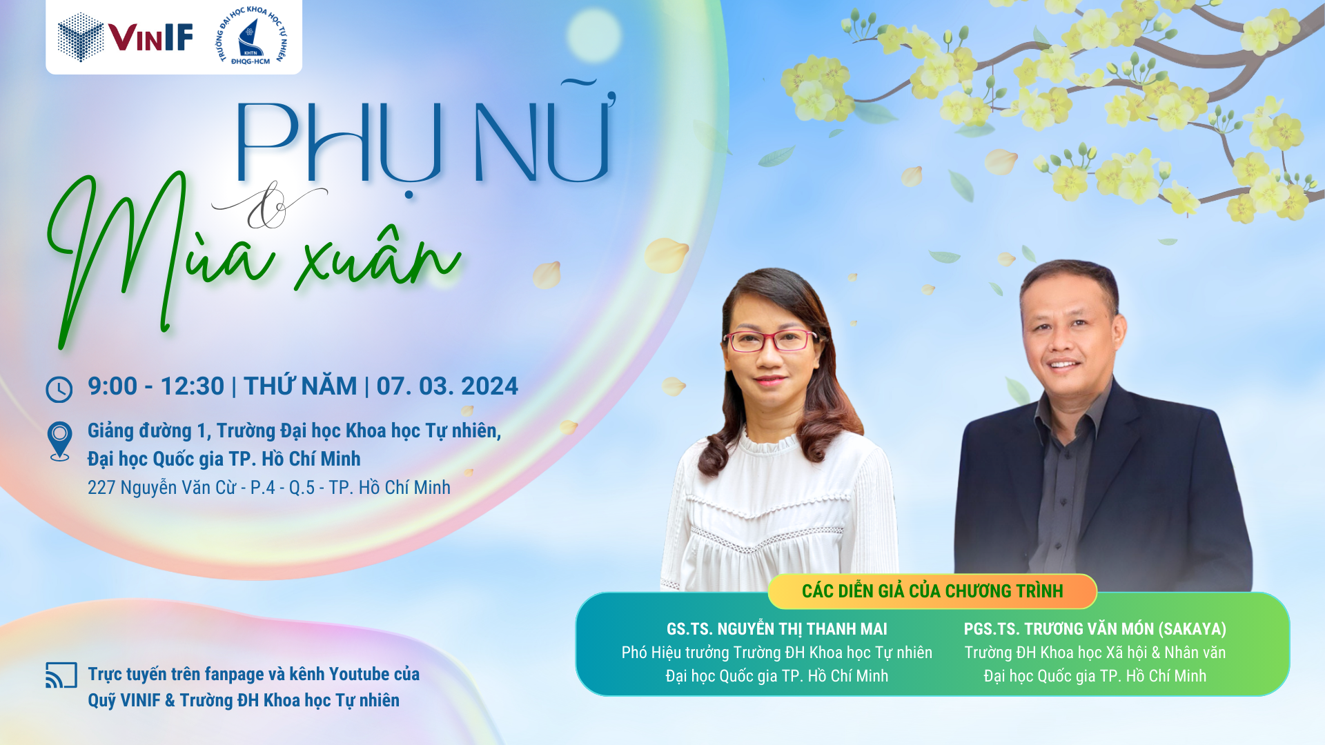 Sự kiện “Gặp gỡ mùa xuân” sẽ được tổ chức tại Trường ĐH Khoa học tự nhiên (ĐH Quốc gia TP.HCM), theo cả 2 hình thức trực tiếp tại hội trường giảng đường 1 và trực tuyến (livestream) trên kênh Fanpage và YouTube của Quỹ VINIF.