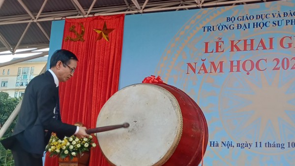GS Hiệu trưởng Nguyễn Văn Minh đánh trống khai giảng năm học mới tại Trường ĐH Sư phạm Hà Nội |