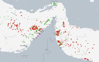 Biểu đồ ký hiệu các tàu đang hoạt động gần khu vực eo biển Hormuz trong ngày 16.4, với phần lớn là tàu hàng (màu xanh) và tàu dầu (màu đỏ) ẢNH: CHỤP MÀN HÌNH MARINE TRAFFIC