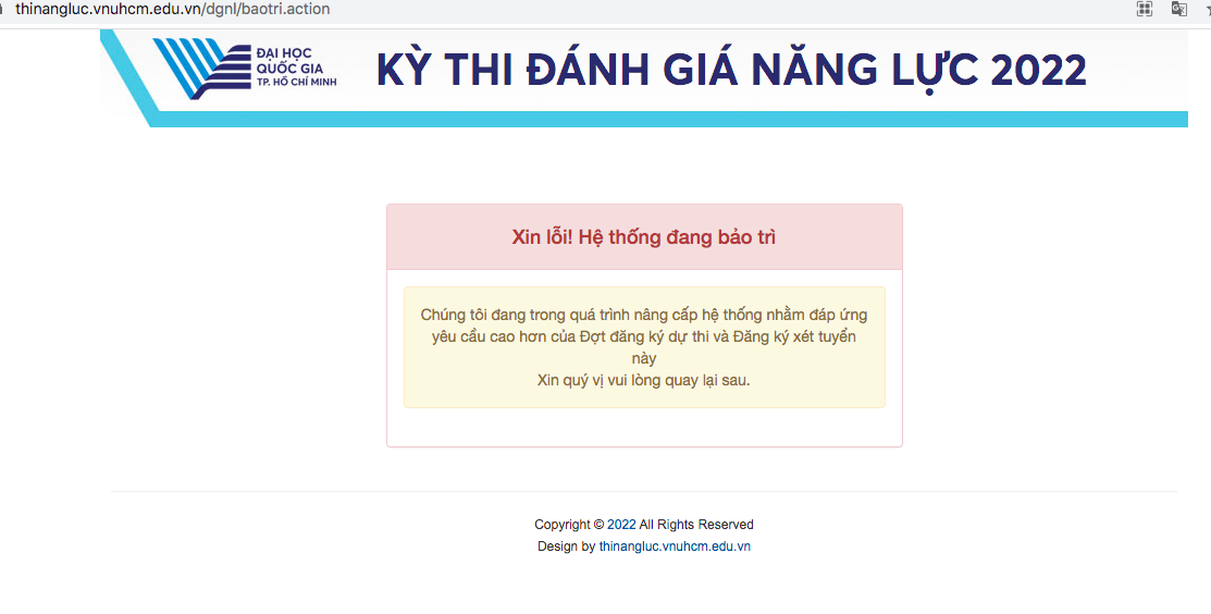 Khi truy cập vào cổng đăng ký thinangluc.vnuhcm.edu.vn/, nhiều thí sinh nhận được thông báo: “Xin lỗi! Hệ thống đang bảo trì. Chúng tôi đang trong quá trình nâng cấp hệ thống nhằm đáp ứng yêu cầu cao hơn của đợt đăng ký dự thi và đăng ký xét tuyển. Xin quý vị vui lòng quay lại sau“.