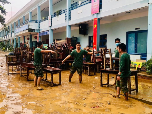 Bộ đội giúp dọn bùn non ở Trường tiểu học Hồng Quang (Q.Liên Chiểu, TP.Đà Nẵng)