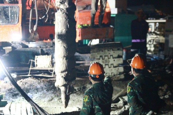 Trong đêm 3.1 và sáng 4.1, lực lượng cứu hộ đã làm việc cật lực, xuyên đêm, dùng phương pháp khoan nước áp lực cao làm tơi xốp lớp đất trong lòng vách thép để giảm lực ma sát giữa lớp đất và cọc bê tông. Đồng thời đưa máy hút đất trong lòng ống vách thép mang ra ngoài.