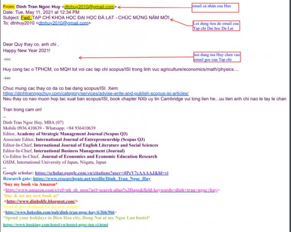 Ông Đinh Trần Ngọc Huy lợi dụng nền tảng bức thư chúc Tết Tân Sửu của Tạp chí Khoa học ĐH Đà Lạt để mời chào khách hàng dùng dịch vụ đăng bài trên tạp chí ISI/Scopus |