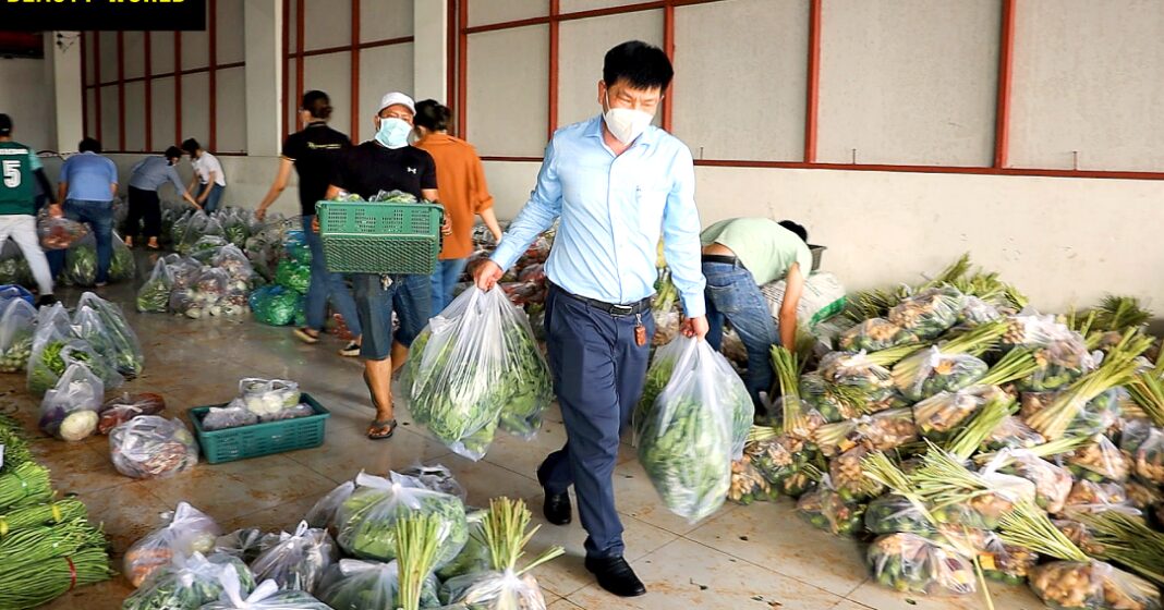Ông Lê Hữu Nghĩa phụ giúp nhân viên phân phối rau trong đại dịch