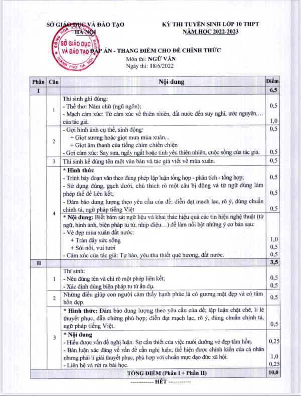Sở GD-ĐT Hà Nội vừa công bố đáp án chính thức các môn thi vào lớp 10 THPT công lập không chuyên năm học 2022 – 2023.