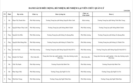 Theo đó, Sở GD-ĐT TP.HCM công bố quyết định bổ nhiệm, bổ nhiệm lại và thuyên chuyển cán bộ quản lý của 9 trường THPT, trung tâm GDTX: