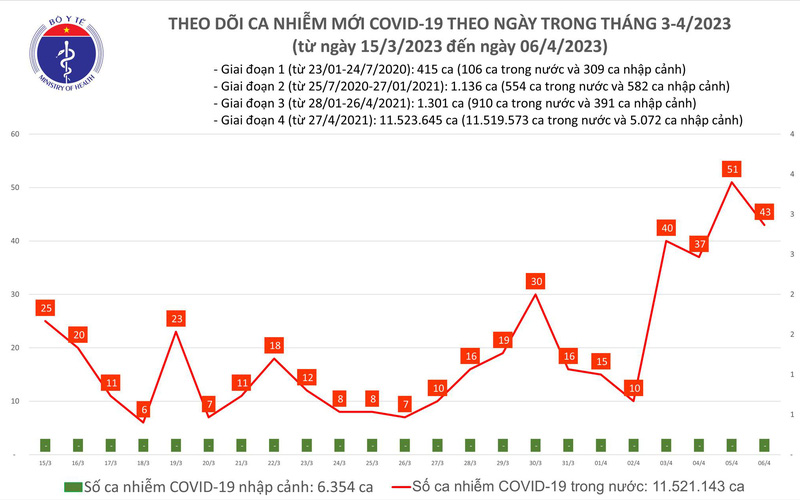 Theo Bản tin Bộ Y tế về tình hình chống dịch COVID-19, ngày 6/4, ghi nhận 43 ca mắc COVID-19 mới; có 14 bệnh nhân được công bố khỏi bệnh.