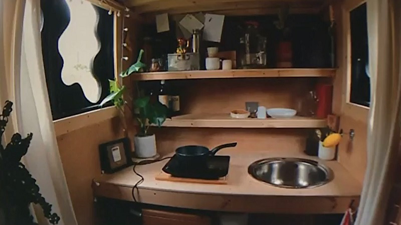 Bên trong căn nhà chỉ rộng hơn 2m2, anh Marshall đặt một chiếc giường treo, một căn bếp ở một đầu, có một chậu rửa và một bếp từ.