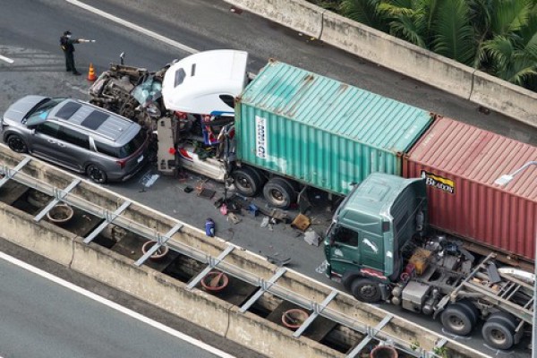 Tại hiện trường, hai xe container dính chặt vào nhau chắn hết 2 làn đường trên cao tốc, các phương tiện biến dạng, hư hỏng nặng.
