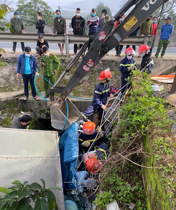 Tai nạn ở Hà Tĩnh: Cứu tài xế kẹt trong cabin xe tải dưới mương nước sâu