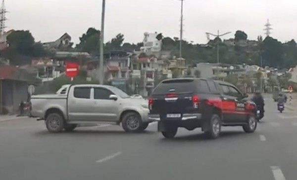 Mạng xã hội mới đây xuất hiện một đoạn video, ghi lại tình huống giao thông nguy hiểm, khi hai ô tô bán tải suýt tông nhau tại khu vực giao lộ.