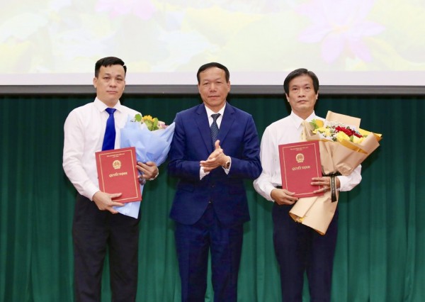 Phó chánh án Thường trực TAND tối cao Nguyễn Trí Tuệ (giữa) trao quyết định bổ nhiệm cho ông Thiện (bìa trái) và ông Tùng |