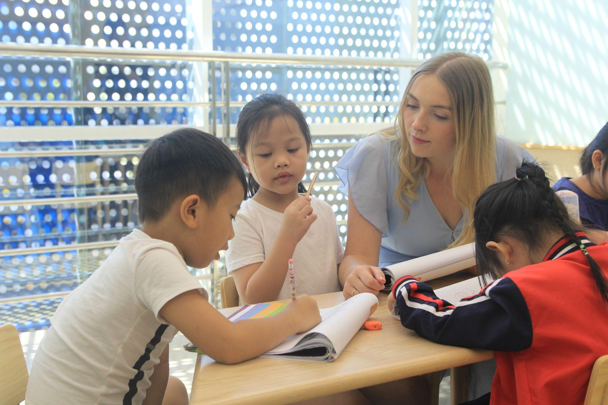 Trung tâm Anh ngữ mới được thiết kế tối giản, theo phong cách Bắc Âu Scandinavian, gồm 1 tầng trệt và 2 tầng lầu với trang thiết bị hiện đại như hệ thống bảng viết 360 độ hỗ trợ sáng tạo, màn hình LCD tương tác…
