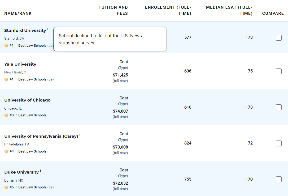 Cũng theo US News, với những trường luật và trường y từ chối cung cấp dữ liệu để xếp hạng, đơn vị này sẽ sử dụng những thông tin có sẵn được công khai để điền vào chỗ trống. Ghi nhận thực tế trên trang web của US News, chúng tôi cũng thấy những trường luật quyết định tẩy chay bảng xếp hạng này được chú thích số 1 cỡ nhỏ cạnh tên trường, trong đó US News ghi chú rằng đây là trường đã từ chối điền vào bản khảo sát thống kê.