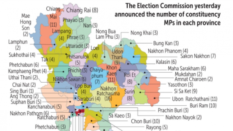 Phân bổ ghế theo khu vực bầu cử. Nguồn: Bangkokpost.Các tỉnh, thành được phân bổ nhiều ghế theo khu vực bầu cử nhất gồm: Thủ đô Bangkok 33 ghế, tỉnh Nakhon Ratchasima 16 ghế, các tỉnh Khon Kaen, Chiang Mai, Ubon Ratchathani 11 ghế…