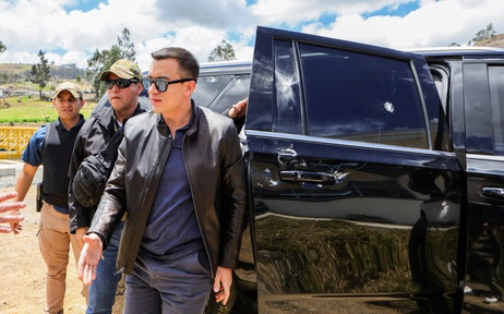 Tổng thống Ecuador Daniel Noboa (bìa phải) bên cạnh vết nứt trên cửa xe ngày 7.10