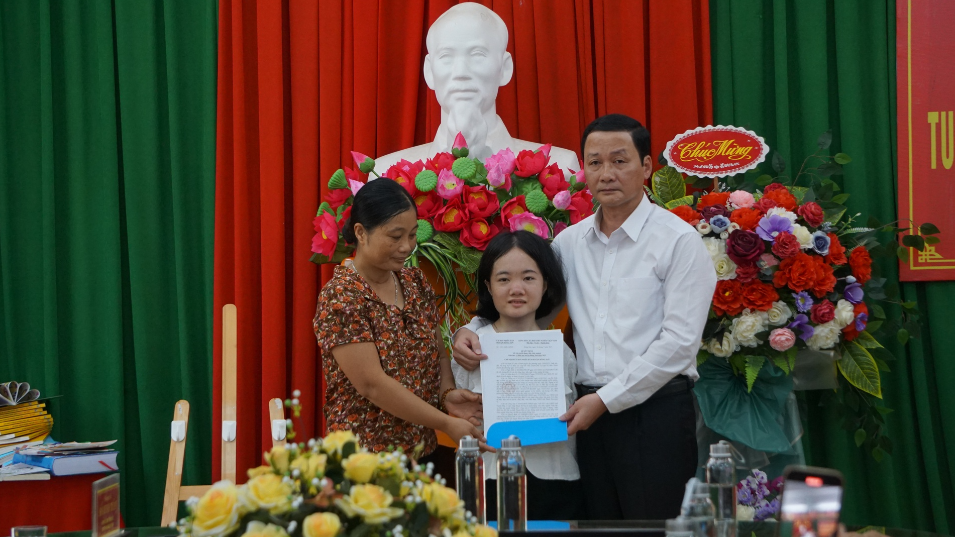 Ông Đỗ Minh Tuấn, Chủ tịch UBND tỉnh Thanh Hóa trao quyết định tuyển dụng cho cô giáo Lê Thị Thắm (đứng giữa)