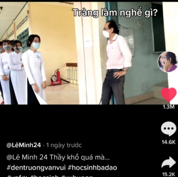Ngày 15.4 một tài khoản tên Lêminh24 trên mạng xã hội Tik Tok lan truyền một đoạn clip 1 phút 55 giây với tựa đề “Thầy khổ quá mà…”. Nội dung đoạn clip ghi lại hình ảnh thầy giáo đứng trước cửa lớp cầm cây thước đặt câu hỏi kiểm tra ôn tập nội dung bài cũ. Các học sinh xếp hàng trả lời ở ngoài lớp, ai trả lời đúng nội dung bài học thì được thầy cho vào lớp. Những câu hỏi ôn tập của thầy đặt ra với nội dung như: “Hình ảnh lá ngón trong truyện ngắn Vợ Chồng A Phủ xuất hiện mấy lần? Tràng làm nghề gì? Tràng đãi thị ăn mấy bát bánh đúc?…”.