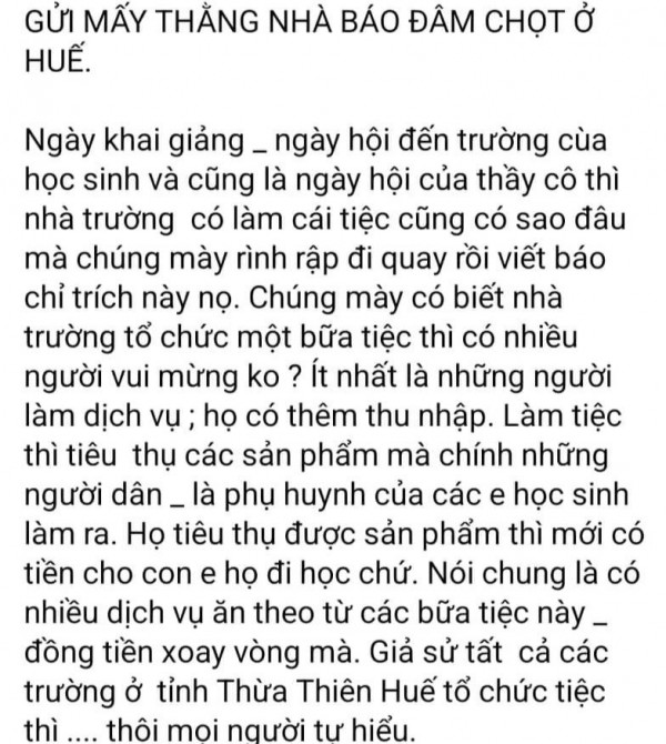 Cụ thể, nam giáo viên này viết: “Gửi mấy thằng nhà báo đâm chọt ở Huế. Ngày khai giảng – ngày hội đến trường của học sinh và cũng là ngày hội của thầy cô thì nhà trường có làm cái tiệc cũng có sao đâu mà chúng mày rình rập đi quay rồi viết báo chỉ trích này nọ. Chúng mày có biết, nhà trường tổ chức một bữa tiệc thì có nhiều người vui mừng không? Ít nhất là những người làm dịch vụ; họ có thêm thu nhập. Làm tiệc thì tiêu thụ các sản phẩm mà chính những người dân – là phụ huynh của các em học sinh làm ra. Họ tiêu thụ được sản phẩm thì mới có tiền cho con em họ đi học chứ. Nói chung là có nhiều dịch vụ ăn theo từ các bữa tiệc này – đồng tiền xoay vòng mà. Giả sử tất cả các trường ở tỉnh Thừa Thiên – Huế tổ chức tiệc thì…. thôi mọi người tự hiểu”.