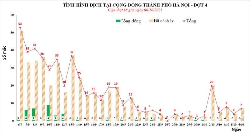 Như vậy, tính từ 18h ngày 5/10 đến 18 ngày 6/10, Hà Nội ghi nhận 7 ca mắc mới trong đó, 6 tại khu phong tỏa, 1 tại khu cách ly.