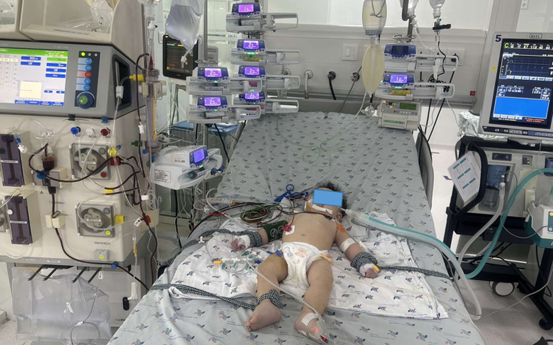 Tai đây, bệnh nhi biểu hiện lơ mơ, mạch nhẹ, chi mát, da nổi bông, nhịp tim trên 200 lần/phút, sốt cao liên tục. Bệnh nhi được chẩn đoán bệnh tay chân miệng độ 4, xét nghiệm men tim tăng cao, men gan tăng nhẹ, toan chuyển hóa nặng.