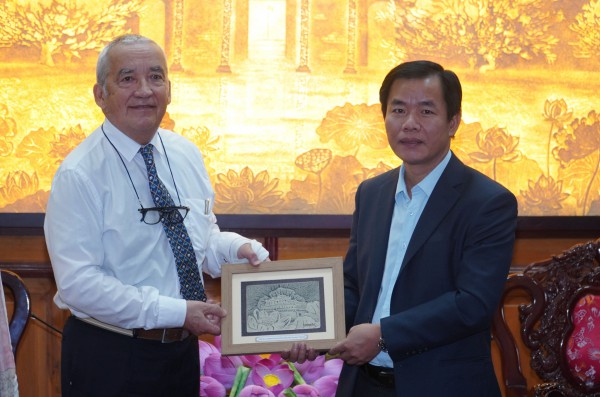 Chủ tịch UBND tỉnh Thừa Thiên – Huế, Nguyễn Văn Phương (phải) trao quà lưu niệm cho GS Hà Vĩnh Thọ |