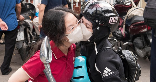 Phụ huynh hôn động viên con trước cổng điểm thi Trường THPT Hùng Vương (Q.5, TP.HCM)