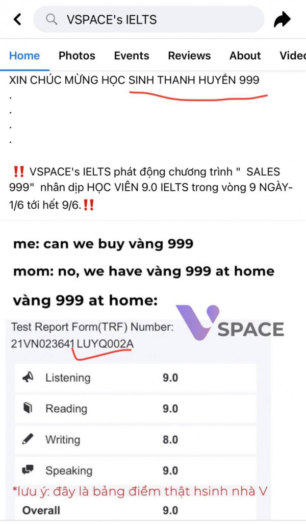 Về phía VSPACE’s IELTS, bà Trần Phan Hà My, Giám đốc điều hành trung tâm, cho biết: “Tất cả hình ảnh và bài viết về kết quả IELTS của T.H đã được gỡ bỏ khỏi Fanpage của chúng tôi. Phía trung tâm đang làm việc với các bên để xác minh thông tin. Chúng tôi sẽ sớm thông báo những diễn biến mới nhất”.