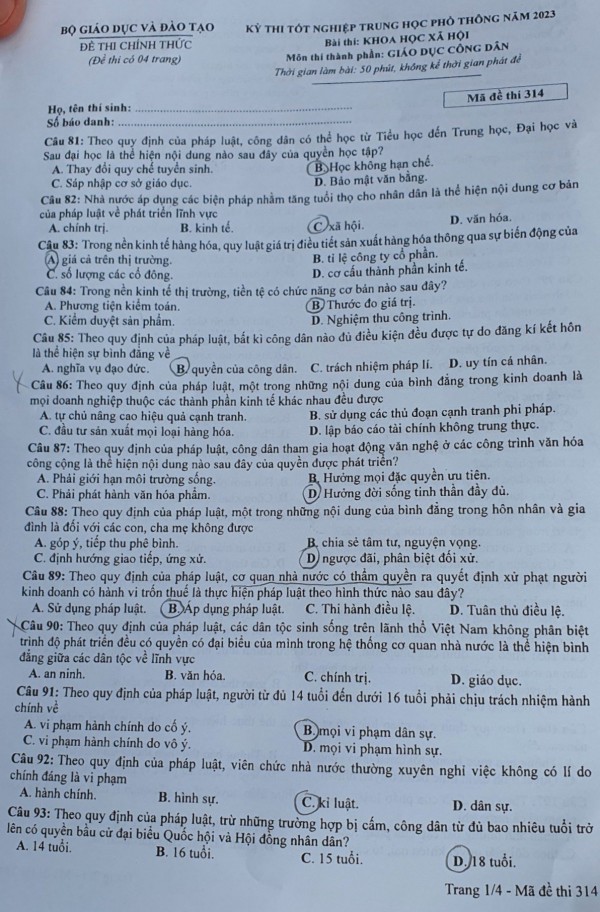 * Đề thi môn giáo dục công dân (bài thi khoa học xã hội) kỳ thi tốt nghiệp THPT 2023