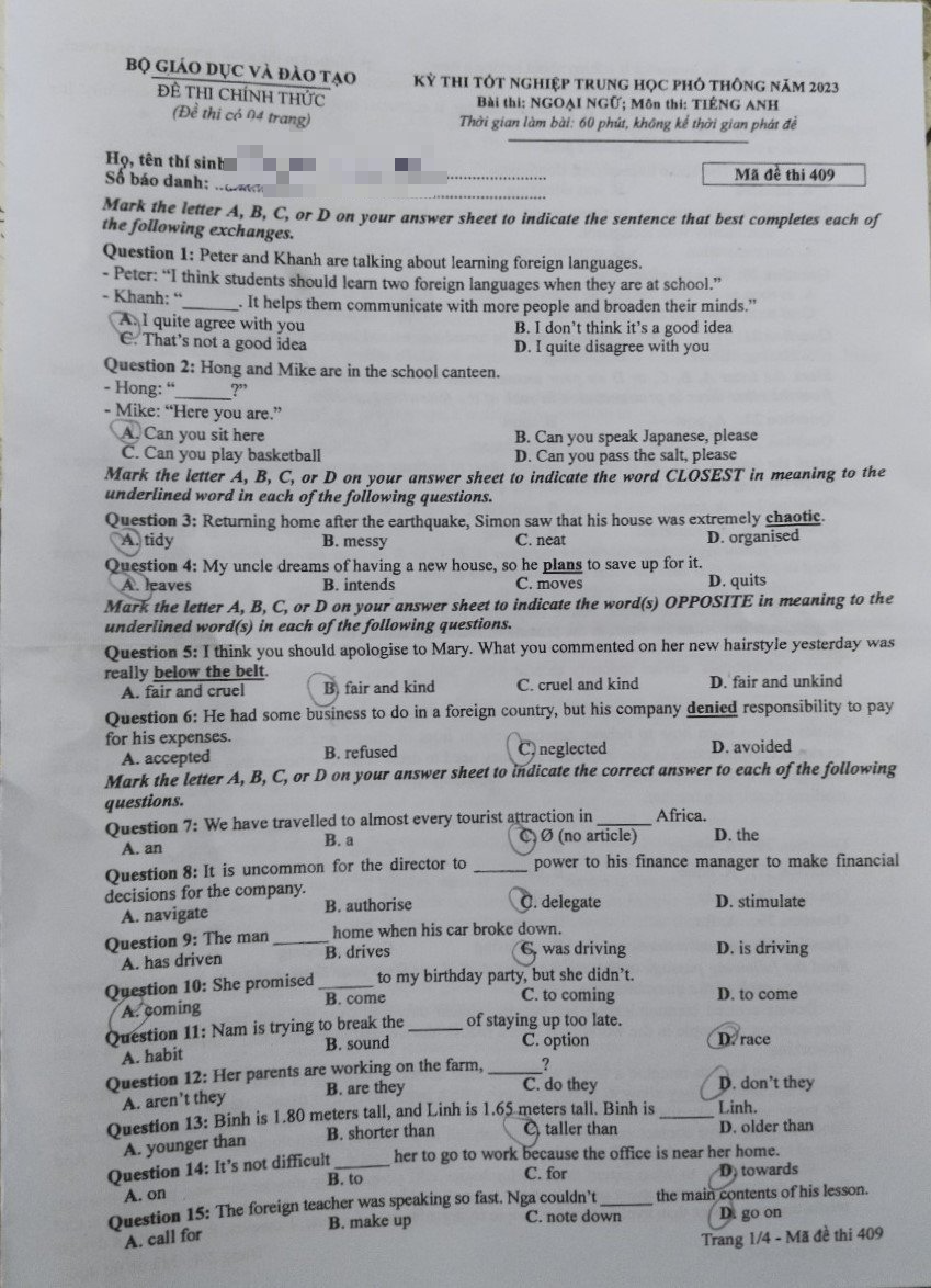 Chiều 29.6, các thí sinh làm bài thi môn ngoại ngữ trong kỳ thi tốt nghiệp THPT 2023. Thanh Niên Online cập nhật đề thi, gợi ý giải đề thi, nhận xét đề thi môn tiếng Anh để phục vụ bạn đọc.
