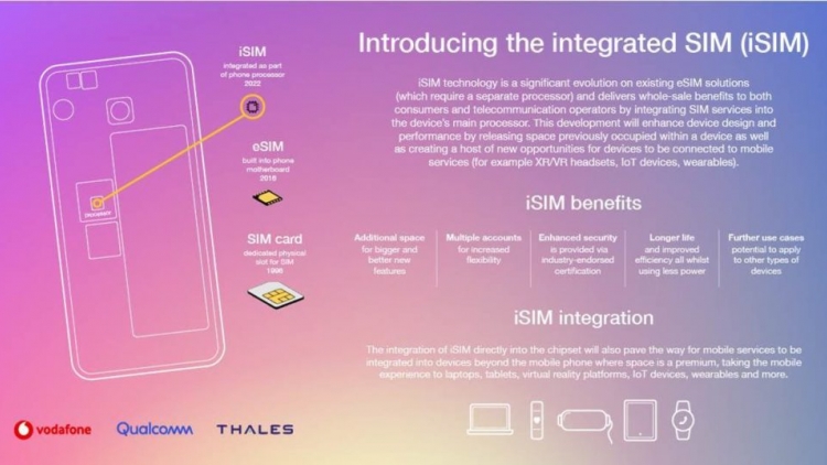 Qualcomm, Vodafone và Thales đã cùng nhau trình diễn smartphone đầu tiên thế giới có công nghệ iSIM (SIM tích hợp), cho phép gắn thẻ SIM vào chip xử lý của thiết bị nhằm loại bỏ nhu cầu về một khe cắm chuyên dụng.