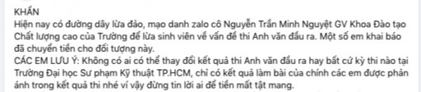 Thông báo này nêu rõ: “Hiện nay có đường dây lừa đảo, mạo danh Zalo cô Nguyễn Trần Minh Nguyệt – giảng viên khoa Đào tạo chất lượng cao của trường, để lừa sinh viên về vấn đề thi Anh văn đầu ra. Một số em khai báo đã chuyển tiền cho đối tượng này”.