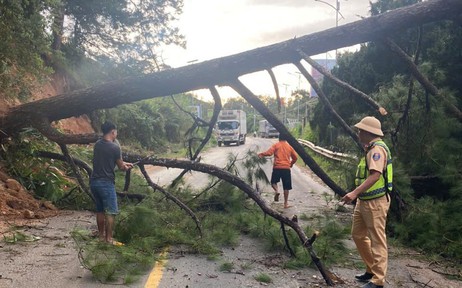 Thông cổ thụ ngã chắn ngang khiến QL27 bị ách tắc cục bộ