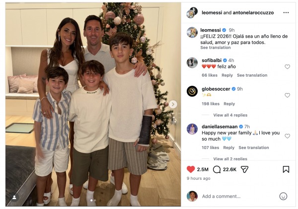 Theo Marca: “Messi đã nói lời tạm biệt năm 2025 cực kỳ thành công của mình và chào năm 2026 bên cạnh gia đình. Đội trưởng đội tuyển Argentina đã đón năm mới cùng vợ, Antonela Roccuzzo, và các con Thiago, Mateo và Ciro, chia sẻ một số hình ảnh về buổi lễ trên mạng xã hội, nơi anh một lần nữa thể hiện khía cạnh cá nhân hơn của mình”.