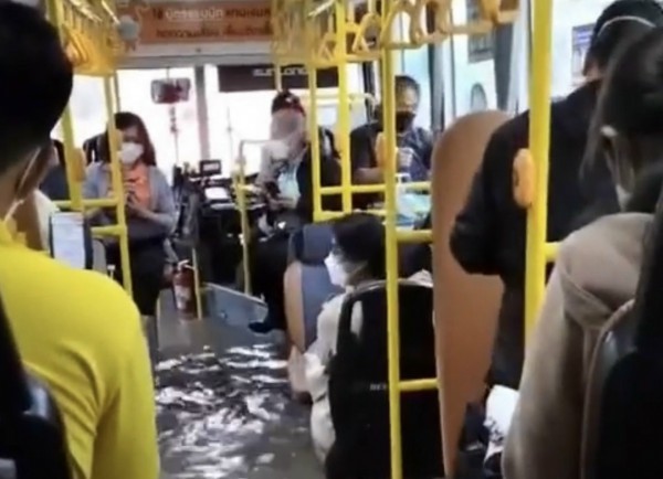 Nước ngập tràn vào xe bus ở Thủ đô Bangkok chiều tối ngày 3/10.Theo đó, Chính quyền Thủ đô Bangkok đã đề nghị các công ty cho phép nhân viên có thể làm việc tại nhà hoặc kết thúc giờ làm việc sớm hơn quy định để giảm bớt ùn tắc giao thông, hạn chế thấp nhất những thiệt hại về người và tài sản do mưa lớn, lụt lội gây ra.