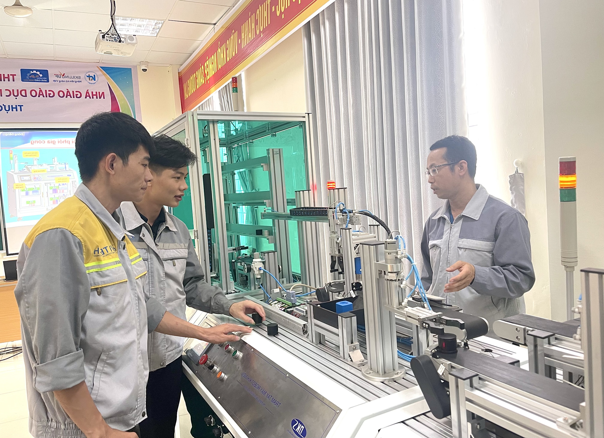 Giáo viên trường nghề hướng dẫn sinh viên thực hành