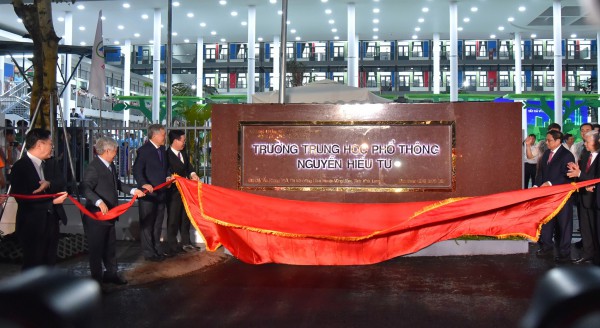 Thủ tướng Chính phủ Phạm Minh Chính; Thường trực Ban Bí thư Võ Văn Thưởng và các lãnh đạo, nguyên lãnh đạo Đảng, Nhà nước… kéo băng khánh thành trường THPT Nguyễn Hiếu Tự |