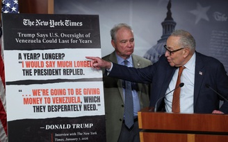 Lãnh đạo phe Dân chủ tại Thượng viện Mỹ Chuck Schumer phát biểu bên cạnh Thượng nghị sĩ đảng Dân chủ Tim Kaine (trái) trong một cuộc họp báo về Venezuela tại Đồi Capitol ngày 8.1.2026 ẢNH: REUTERS
