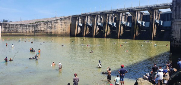 Khu vực sau cửa xả tràn thủy điện Trị An. Người dân bắt cá khi cửa xả tràn được đóng lại