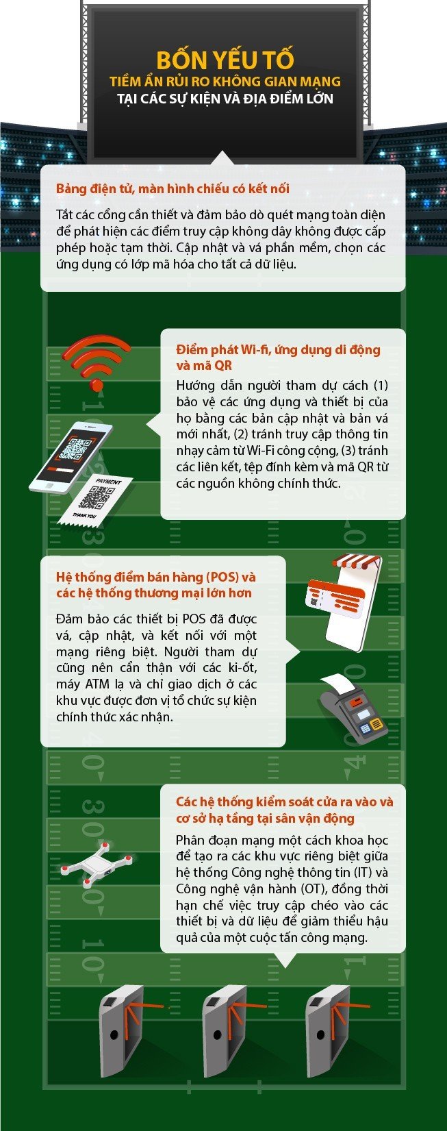 Các mối đe dọa an ninh mạng đối với các sự kiện và địa điểm lớn rất đa dạng và phức tạp, đòi hỏi sự cảnh giác và hợp tác giữa các bên liên quan để ngăn chặn và giảm thiểu ảnh hưởng. Với thị trường thể thao toàn cầu được định giá hơn 600 tỷ USD, các đội thể thao, các giải đấu lớn, các hiệp hội thể thao toàn cầu và cả khán giả là những nguồn dữ liệu quý giá mà tội phạm mạng mong muốn có được.